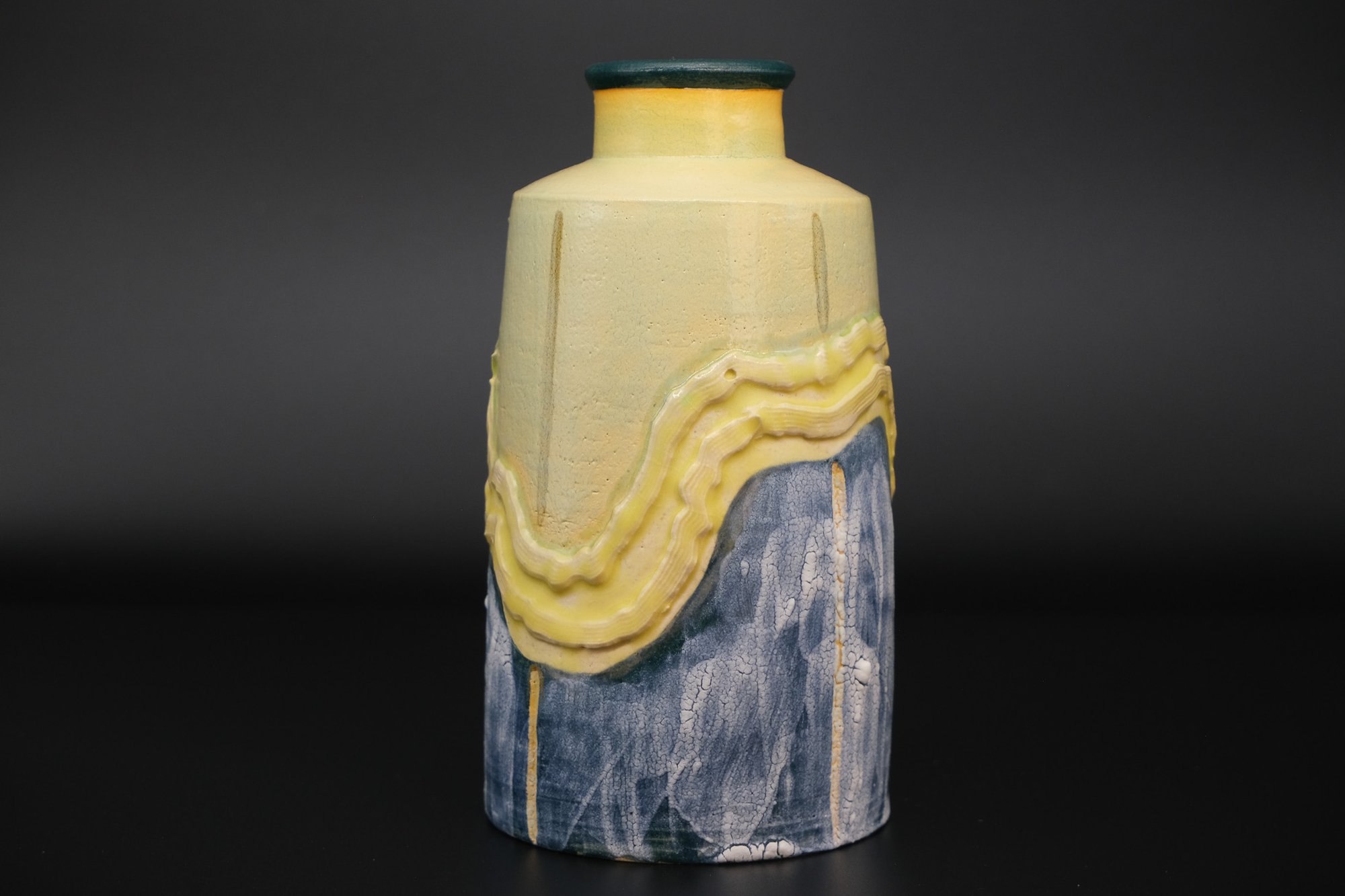 Wheel thrown ceramic vase with layered yellow glaze and sculptural ridges over a blue crackle base. Features a satin-to-matte finish and bold vertical form. Ideal for displaying dried or fresh flowers .