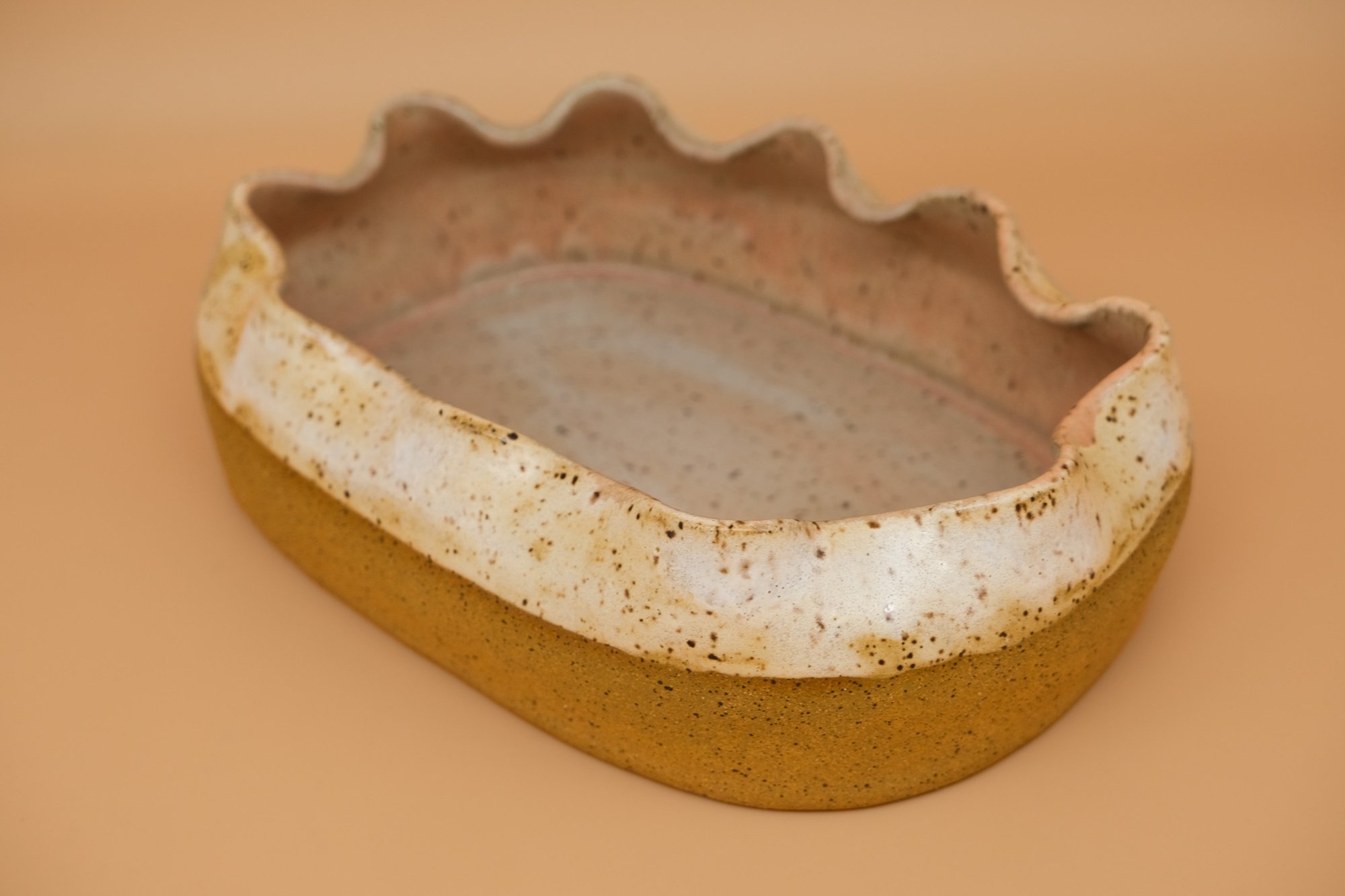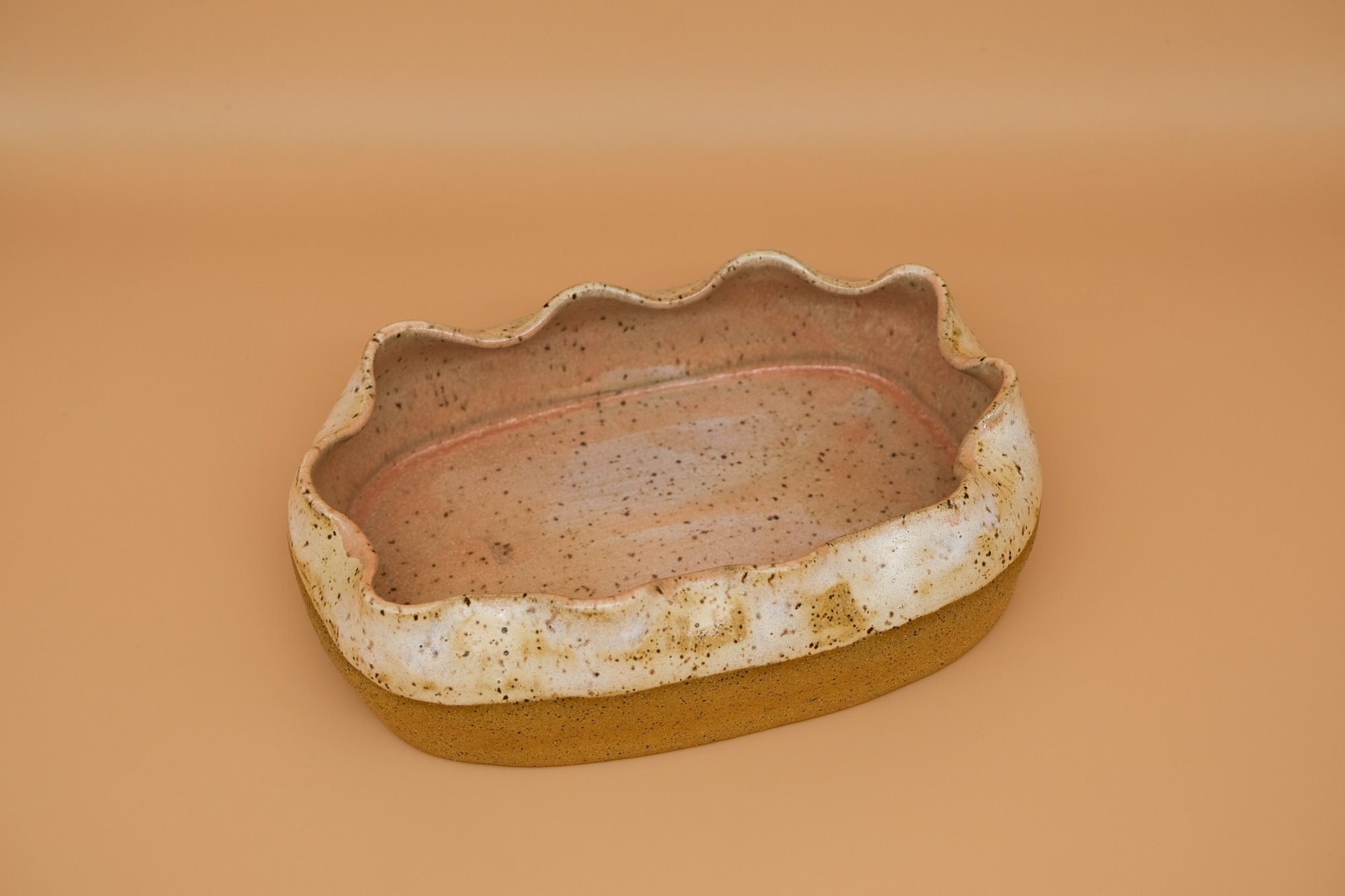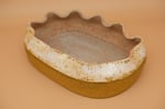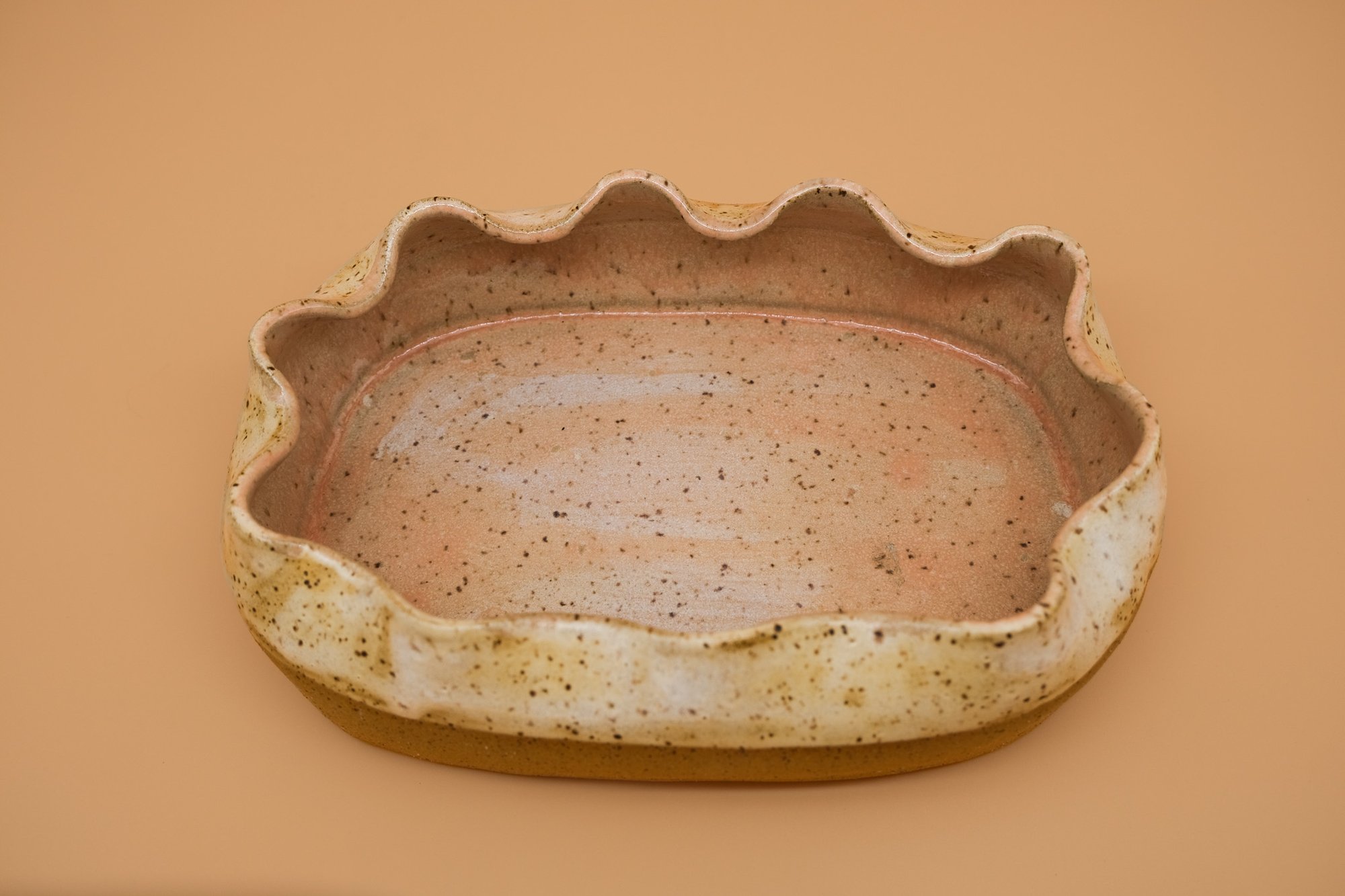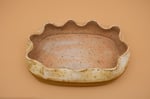 Hand built ceramic dish made from speckled buff stoneware clay. Features soft wave-like edges, a warm toasted glaze, and a satin finish. Dishwasher safe. Ideal as a catchall, serving piece, or centerpiece. Approx. 9" × 6.25" × 3.5".