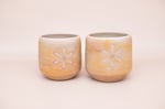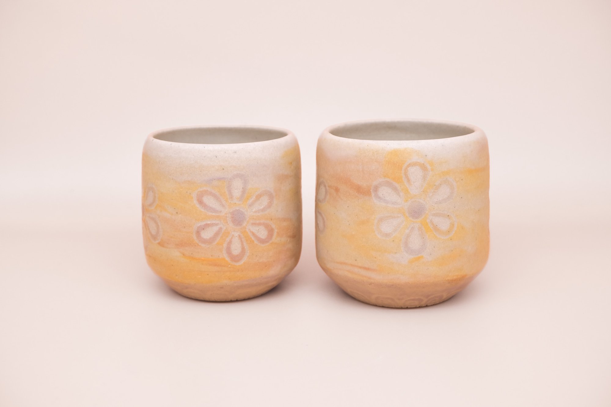 Handmade ceramic cup. Holds 8oz of liquid. Dishwasher safe!