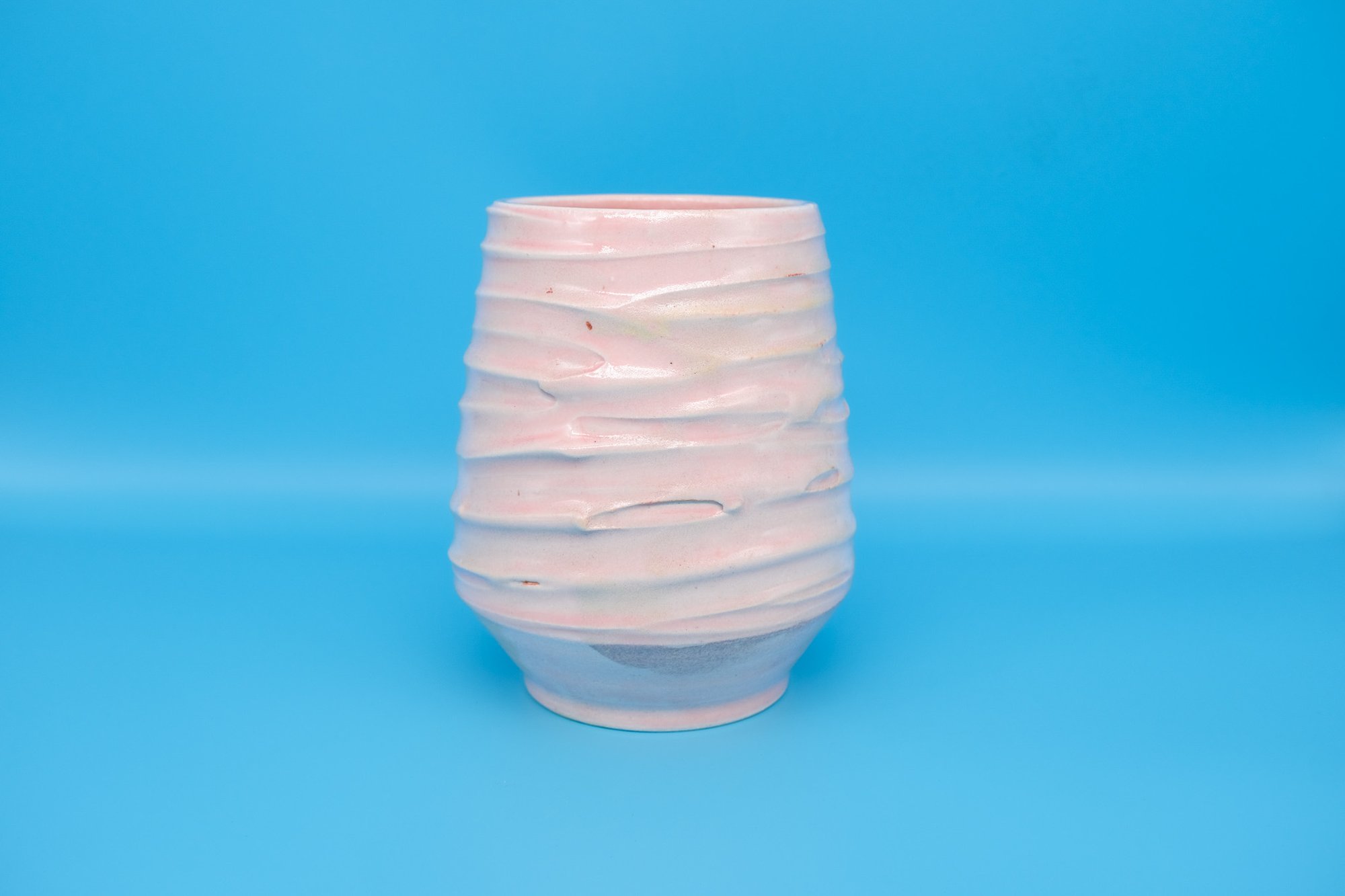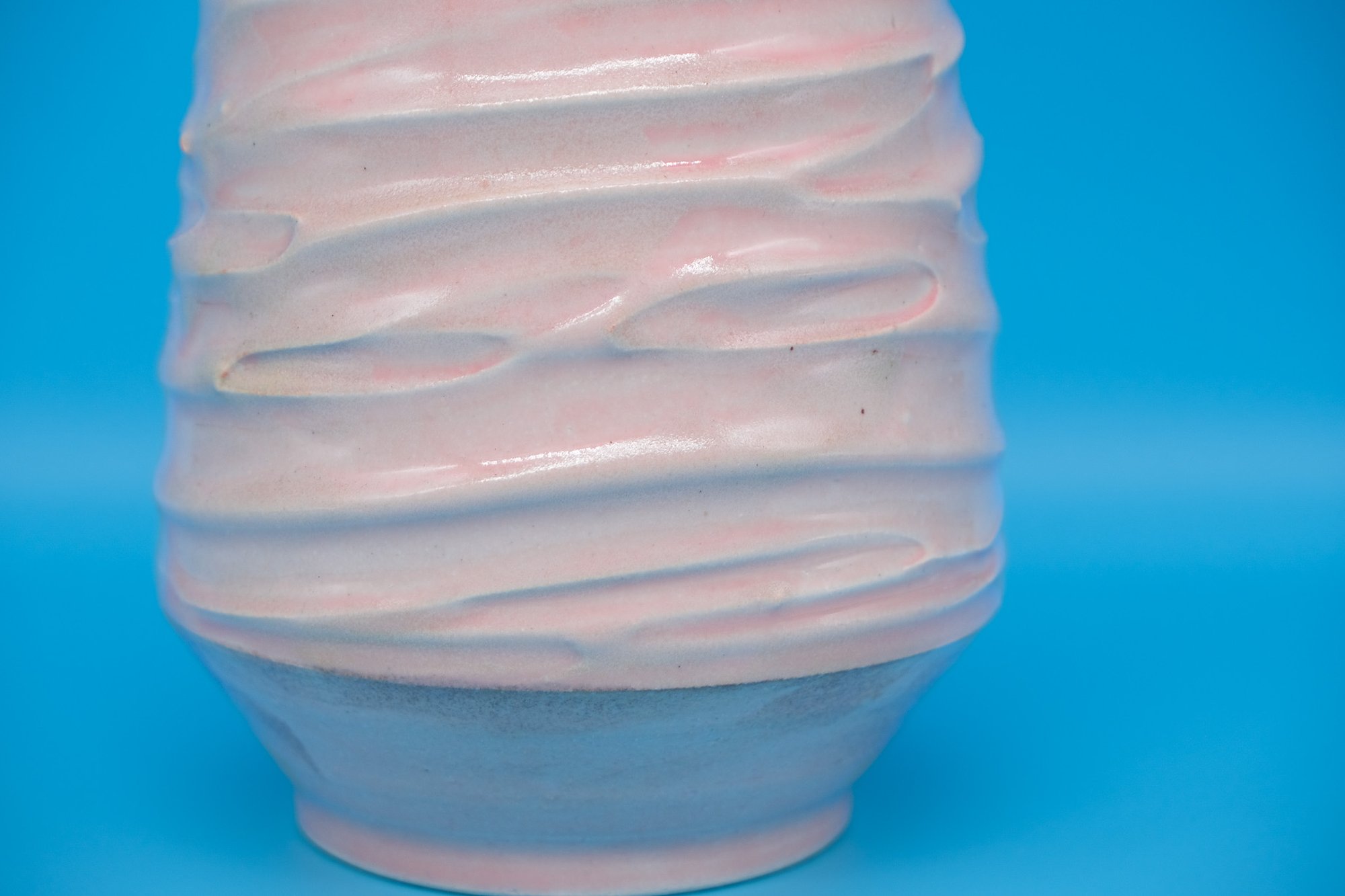 Wheel-thrown ceramic vase with soft pink glaze and rippled texture. Satin finish with subtle glaze variation. Ideal for fresh or dried flowers, or as a sculptural accent. Approx. 4.5" wide × 7.75" tall.