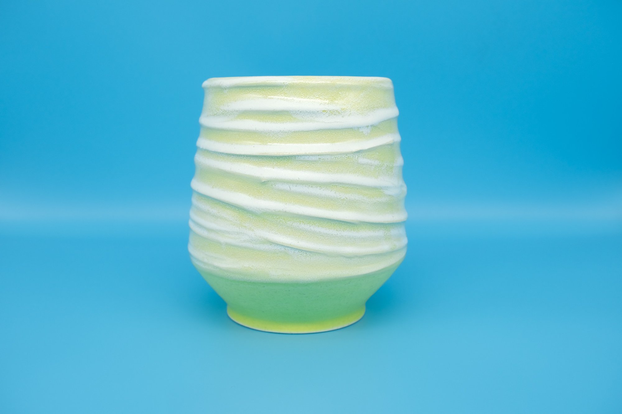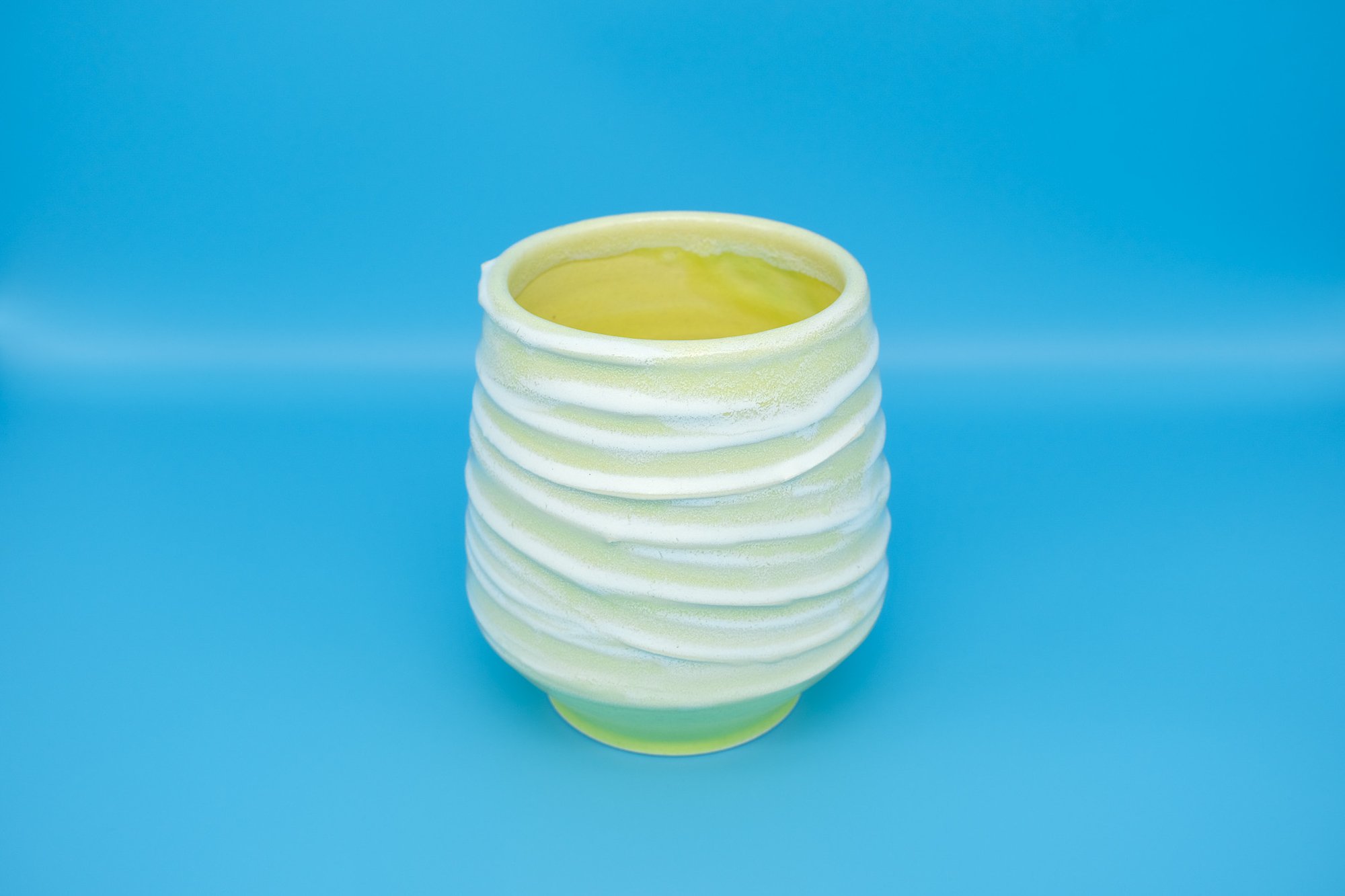 Wheel-thrown ceramic vase with bright yellow glaze and layered white ripple texture. Mild gloss/satin finish with sculptural ridges. Great as a flower vase, pencil cup, or stand-alone art piece. Approx. 5.25" wide × 5.25" tall.