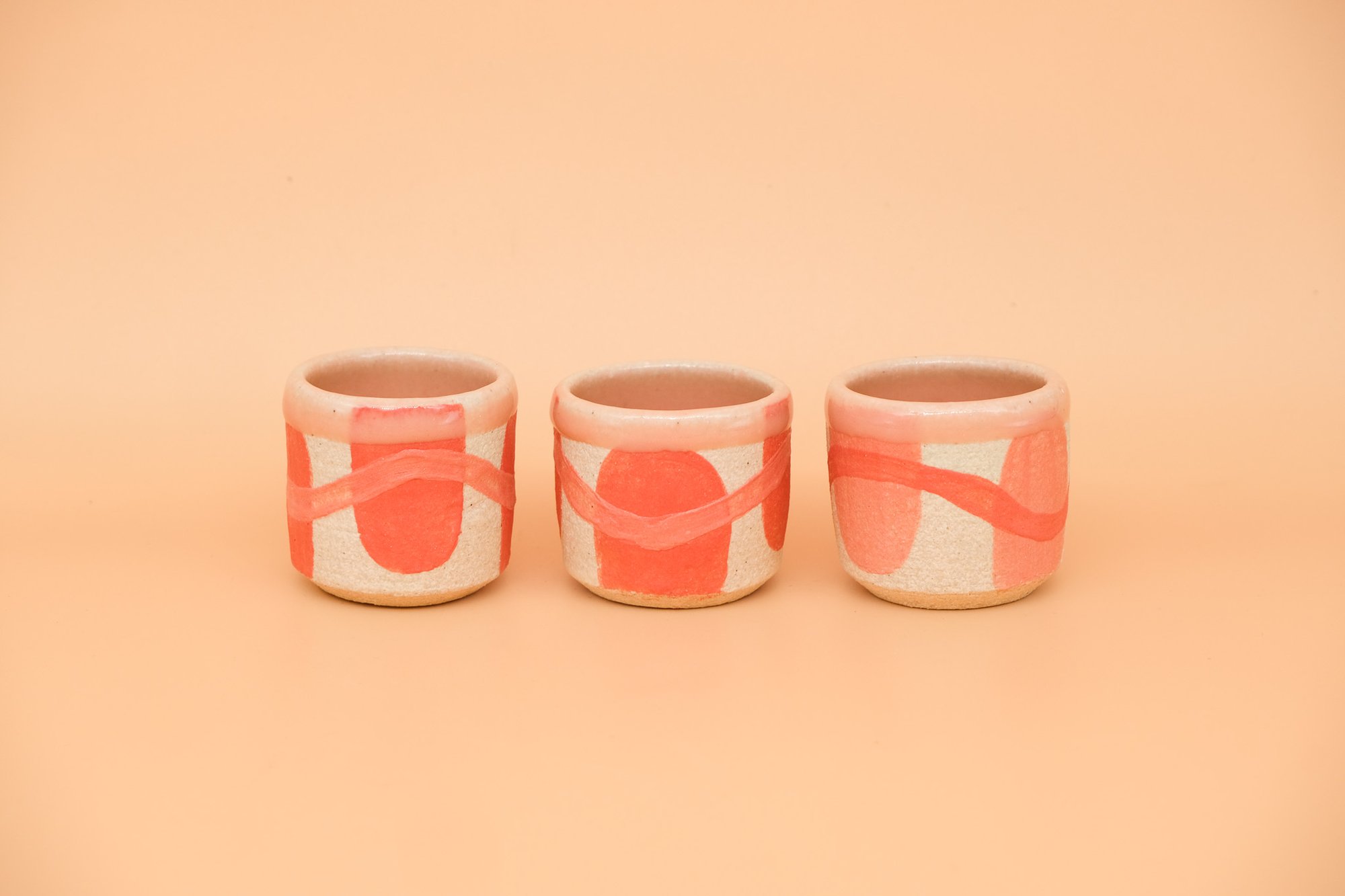 Wheel thrown and hand painted shot glass. Made with white stoneware, glazed with abstract shape pattern and pink gloss glaze on the inside. Holds 1oz of liquid. Dishwasher safe.